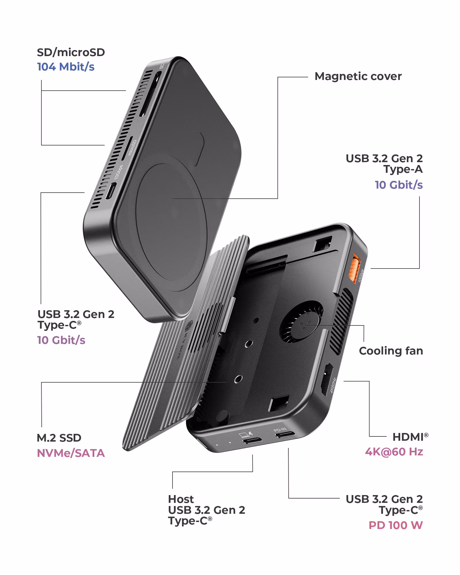 - 7-i-1 dockingstasjon med integrert SSD-kabinett