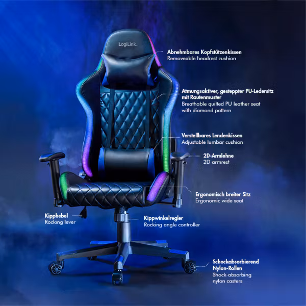 Spesielt skreddersydd for spillernes behov: LogiLink-spillstolen: Designet for episke spilløkter. Fordyp deg i uovertruffen komfort og stil med LogiLink-spillstolen. Denne stolen er spesialdesignet for spillere som ønsker å oppleve timevis med spilløkter uten å gå på kompromiss med ergonomi og komfort. LogiLink-spillstolen har et bredt sete som sikrer optimal vektfordeling – perfekt for spillmaratoner. Det pustende, quiltede PU-skinnet med diamantmønster sikrer en komfortabel sitteopplevelse, selv når det blir varmt. Ytterligere funksjoner som avtakbar nakkestøtte og justerbar korsryggpute gir individuell tilpasning til dine behov.