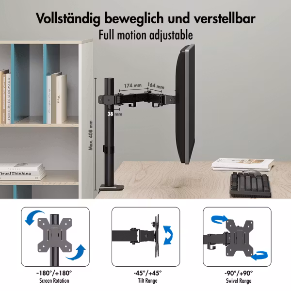 LogiLink BP0216 er en profesjonell monitorarm for enkeltstående skjermer, ideell for bordmontering. Passer til skjermer med diagonal 17–32" og maksvekt 10 kg. Den kombinerer stål og robust plast for høy stabilitet og gir stor fleksibilitet for optimal ergonomisk posisjonering.