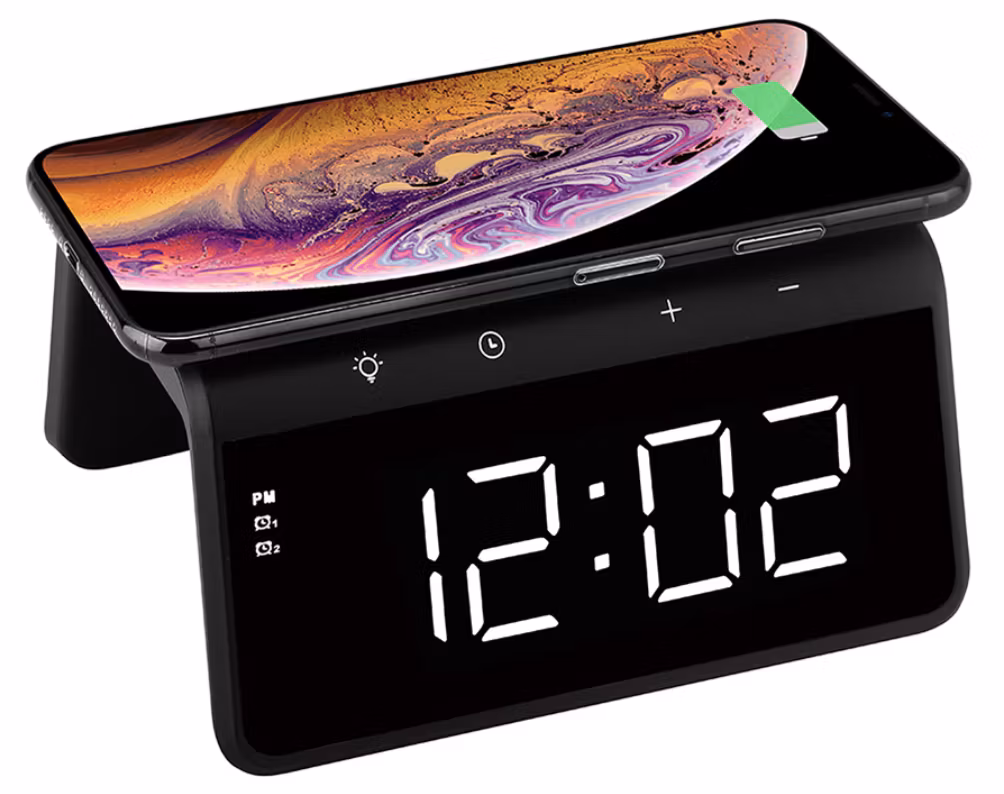 Flott vekkerklokke med trådløs lading, perfekt på for eksempel nattbordet.