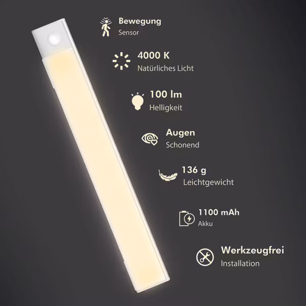 LED underskapslampe – 30 cm, 100 lm, med bevegelsessensor, hvit