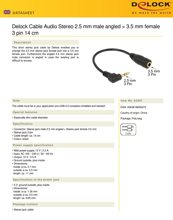 2,5 mm jack hann (vinkel) til 3,5 mm hunn