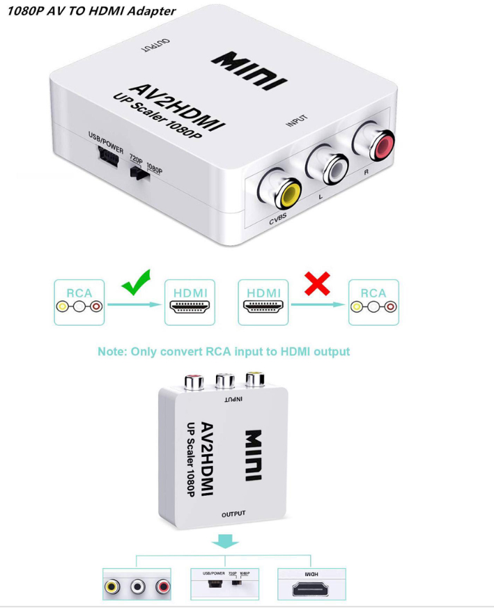 RCA Composite AV CVBS to HDMI Audio Video Mini Adaptor Full HD 1080P with USB Charge Cable Support PAL/NTSC for PS3/STB/ Xbox/VHS/VCR/Blue-Ray DVD Players/TV/PC