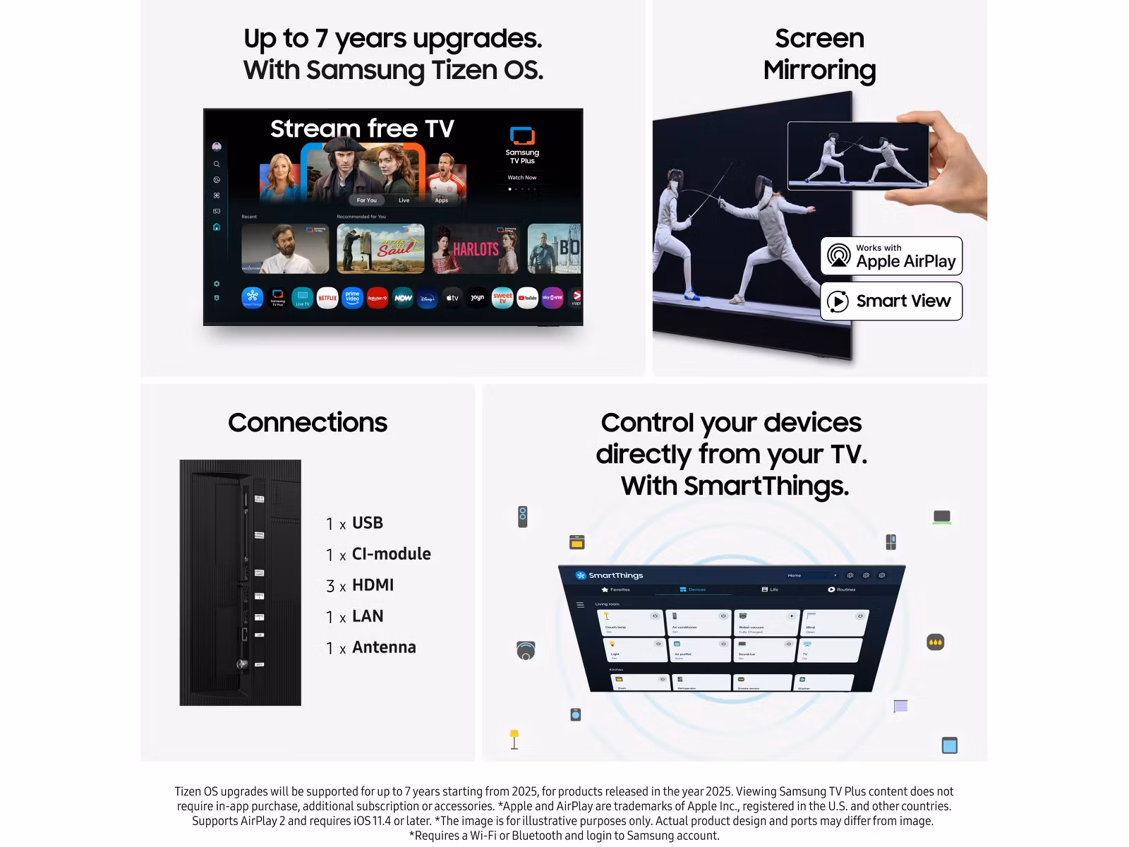 | Internet Streaming Services | HbbTV 2.0.4, Samsung TV PLUS |
