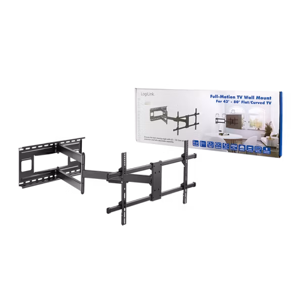 Fleksibelt og solid veggfeste fra LogiLink, egnet for både flate og buede skjermer fra 43 til 80 tommer. Gir mulighet for tilt, swivel og justering av nivå, slik at skjermen alltid kan plasseres i optimal vinkel. Integrert kabelstyring holder kabler ryddige og skjulte, og monteringssett med nivåhake følger med for enkel og korrekt installasjon.