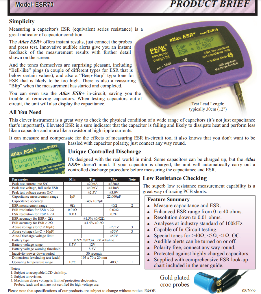 Den lader automatisk ut kondensatorer om det er strøm på de før måling utføres, bryr seg ikke om polaritet, det skjønner den selv. Så når vi scrapper hovedkort for deler er dette et must måleverktøy å ha på verkstedbenken. Samme gjelder når vi skal reparere tv`er, hvor vi vet det er en av kondensatorene som er problemet, f.eks at tv virker i 3 sekunder, deretter skrur seg av. For en glede å ha et slikt produkt når en jobber med elektronikk. Kan også utføre målinger selv om komponenten er på et kretskort. OBS: aldri ha strøm tilkoblet kretskortet du tester.