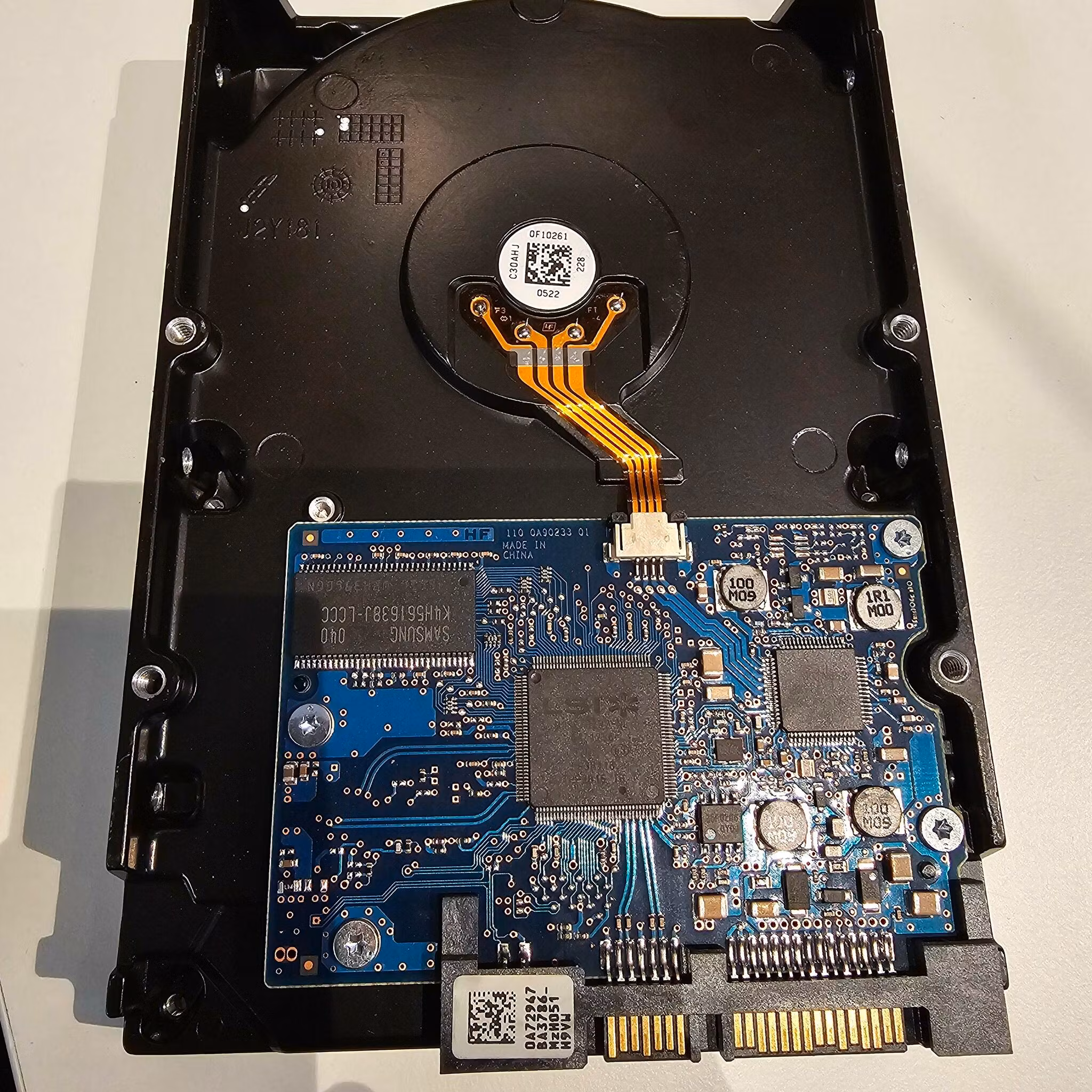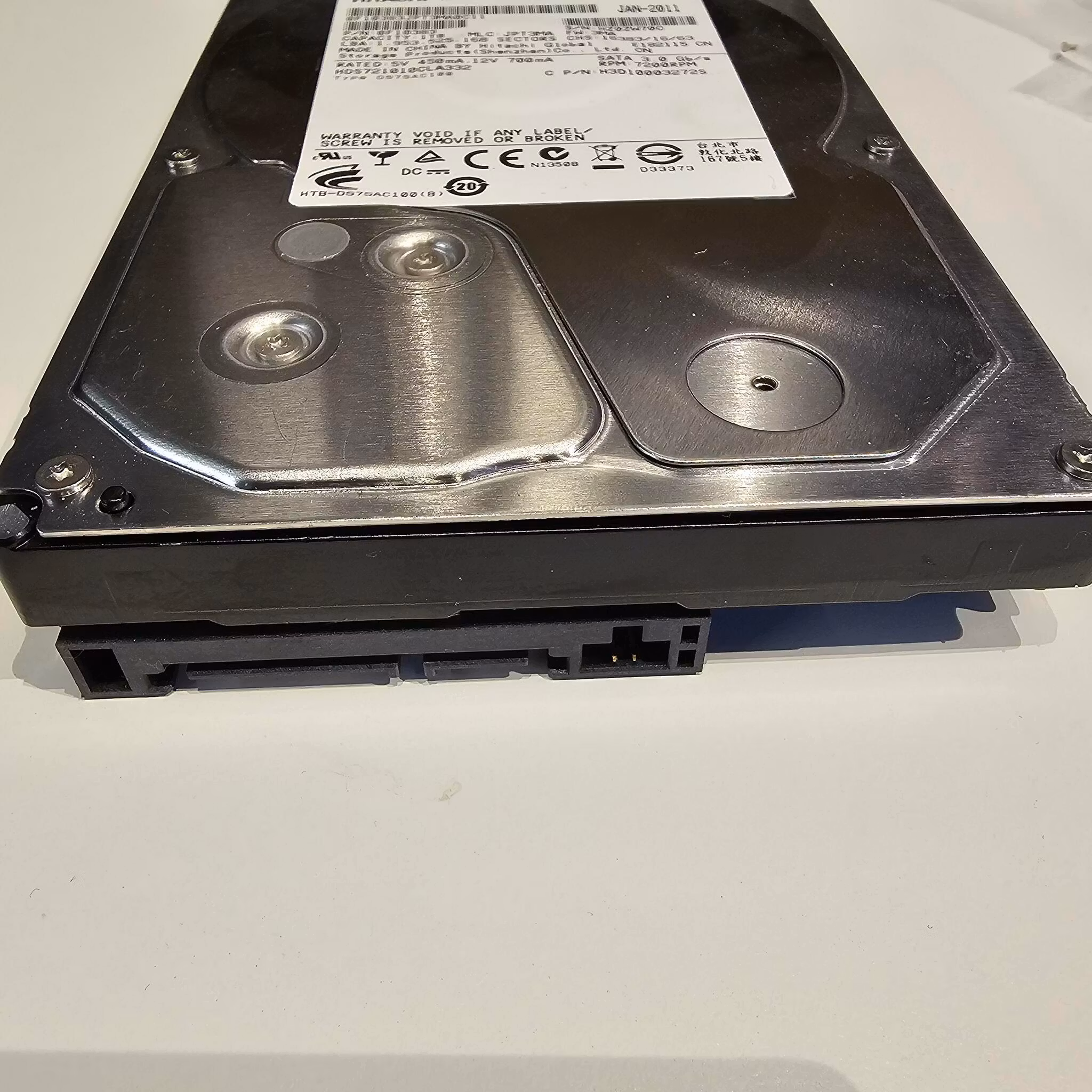 Denne harddisken (Hitachi 0F10383 1TB) er kun tilgjengelig som en DONORDISK for verksted og reparasjonsformål. Enheten spinner normalt, men i CrystalDiskInfo får vi beskjed om at enkelte sektorer er defekte. Lesehodene og kretskortet er intakte.