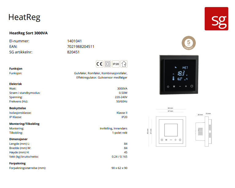 Termostat med mange muligheter. HeatReg lar deg styre opptil 3000W varmekabel. Det er mulig å regulere ønsket temperatur manuelt eller stille inn en timer som sørger for at HeatReg bytter mellom Comfort og ECO-modus. På denne måten kan du optimalisere energiforbruket ved for eksempel å la HeatReg gå i ECO-modus om natten og når du ikke er hjemme. I tillegg er det mulig å aktivere åpent vindu-funksjon, barnesikring, maks temperaturgrense på gulvføler med mer.