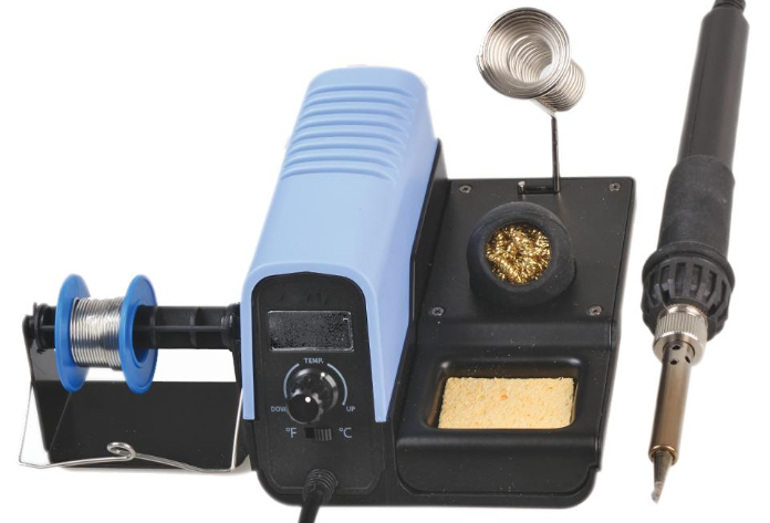Soldering station, supplied with soldering iron, iron tip, stand, 2m solder reel, brass cleaning ball and sponge.