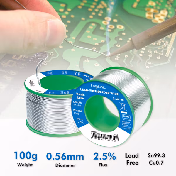 Profesjonelt blyfritt loddetinn fra LogiLink, egnet for både hobbybruk og profesjonelt arbeid. Tråden leveres på 100 g snelle og har god loddeevne samt høy elektrisk ledningsevne. Kolofoniumkjerne bidrar til å redusere oksidasjon under lodding og gir rene og stabile loddeforbindelser.