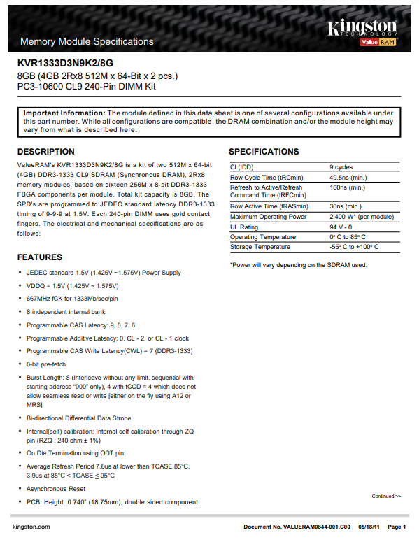 KVR1333D3N9K2/8G 8GB (4GB 2Rx8 512M x 64-Bit x 2 pcs.) PC3-10600 CL9 240-Pin DIMM Kit
