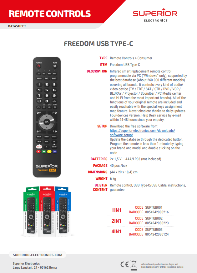 Genial Universal TV fjernkontroll som programmeres via medfølgende programvare og USB kabel.