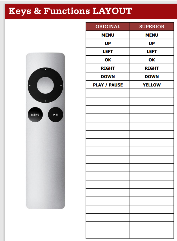 Kan styre de fleste APPLE TV-er med infrarød - da må man ha fri sikt til tv-boksen. Begrenset funksjonalitet, men dekker grunnleggende bruksbehov. Ta kontakt for videre informasjon.